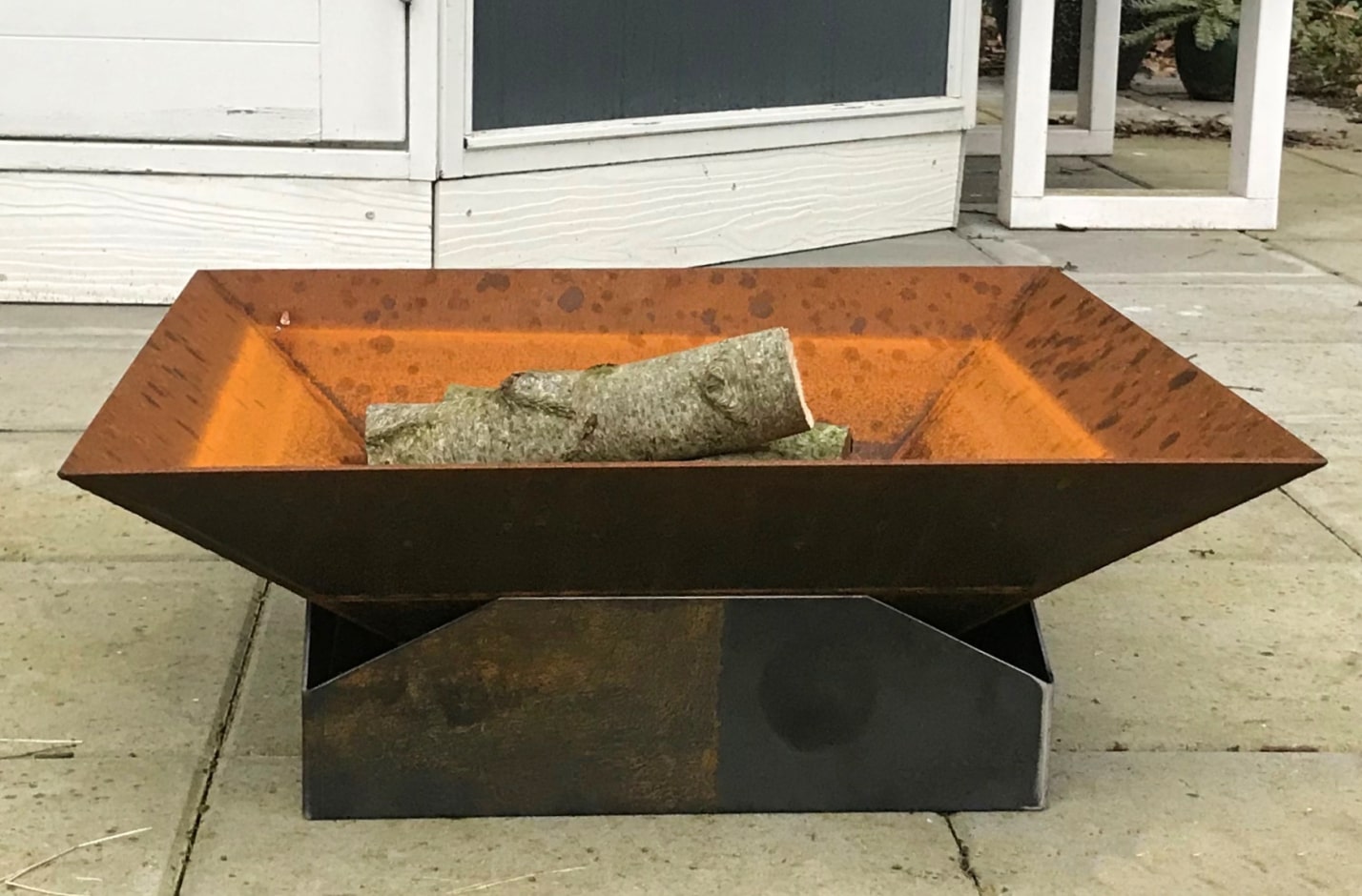 Facet bålfad med sokkel, som lader varmen slippe ud, så varmen under bålfadet mindskes.